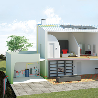 Solución adecuada para edificios de nueva construcción en los que se desee realizar instalaciones de baja temperatura tanto para calefacción como para el enfriamiento de los ambientes. Para ello, se aprovecha la energía contenida en el aire (bomba de calor condensada por aire), o en el subsuelo (bomba de calor condensada por agua/geotérmica), para alimentar la bomba de calor, y la energía solar para calentar el depósito de acumulación de ACS. Con esta solución es posible no sólo calentar mediante paneles radiantes, sino también enfriar, ya que el control es capaz de gestionar la deshumidificación de los ambientes activando el fan coil específico, gracias a los terminales de usuario de zona con sonda de temperatura y humedad.